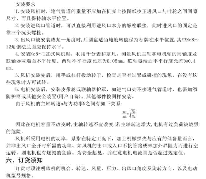 一、风机选用参考、安装维护使用说明、常见故障分析、订货注意事项